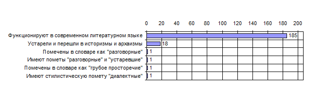 Таким образом, их 207 анализируемых слов лишь 18 устарели. Кроме того, четыре слова зафиксированы в словаре со стилистическими пометами, а два из них находятся за пределами литературного языка. Остальные функционируют в русском литературном языке до настоящего времени.