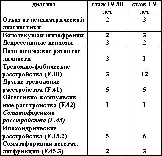 только три психиатра использовали традиционные для отечественной психиатрии нозологические обозначения. Это «невротическое развитие личности», «ипохондрическое развитие личности» и «затяжное реактивное состояние с фобическим синдромом». Их стаж 50, 40 и 33 года;