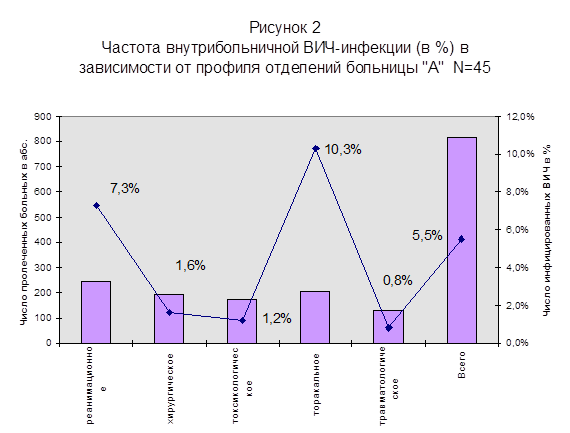 Как установлено при эпидемиологическом обследовании очага ВИЧ - инфекции в больнице “А”, в реанимационном отделении инфицировались 18 детей из 45 (40,0%), в травматологическом - 1 ребёнок (2,0%), хирургическом - 6 (7,0%), токсикологическом - 2 (4,0%), торакальном - 21 (47,0%). На рисунке 2 представлена частота внутрибольничной ВИЧ - инфекции в зависимости от профиля отделений.
