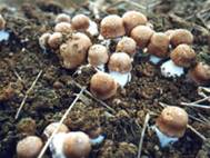 Первые опыты японских и американских медиков получили широчайший резонанс - эти грибы понадобились всем: и неизлечимо больным людям, и тем, кто упорно не хотел сдаваться старости. Спрос диктует предложение. Жители деревушки Пайдед (Piedade) все силы бросили на собирательство и продажу этих грибов, для них агарики действительно оказались золотыми. За несколько лет тропический лес был опустошен. Уже в 80-х годах этого вида агарика в округе не было вообще. К счастью, Мюррил и японские микологи успели вывезти часть мицелия и смогли выделить какое-то количество спор этого вида. Но искусственное выращивание агарика было крайне трудоемким – оно не поддавалось никаким правилам выращивания японских грибов. Нужна была особая температура (не ниже 35 градусов), тропическая влажность и возможность симбиоза именно с теми тропическими растениями, которые произрастали в округе деревни. Только в конце 90 –х были получены первые опытные выращенные образцы этих грибов. Но – увы, они были гораздо больше по величине своих диких сородичей. В диком виде агарики еще называют грибами-кнопками – они чуть - чуть проклевываются над землей и еле видны сквозь травяной покров. Шляпка возникает из почвы как маленькая пуговка и вырастает от одного до двенадцати дюймов (2,5 – 30 см) в диаметре, в зависимости от вида. В начале шляпка белоснежная, но в течение трех дней она становится розовой, фиолетовой, и затем черной. Характерен очень резкий запах этих грибов, обычно местные жители на них натаскивают собак, чтобы легче было определить, где растут эти крохотные невидимки.