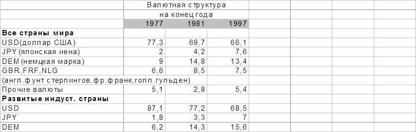 Таблица 1. Изменения в валютной структуре стран мира в 1977-1997 гг. ( в % от общей величины)
