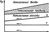 В случае, если в условиях затухающей инфляции цены на реализуемую продукцию снижаются значительно быстрее, чем на приобретаемые ресурсы, номинальный доход начинает падать также ускоренными темпами (линия п направлена круто вниз).