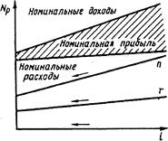 В случае, если вложения в проект растянуты во времени, цены на приобретаемые ресурсы и реализуемую продукцию под влиянием инфляции меняются с достаточно близкими темпами (для простоты мы приняли их равными). Тогда номинальный доход оказывается нечувствительным к инфляции и практически не меняется (линия п горизонтальна).
