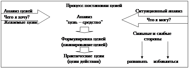 Постановка целей – это временный процесс, поскольку в течении деятельности предприятия может выясниться, что те или иные параметры изменились, что приводит к необходимости изменения цели. Для самоменеджмента фундаментальное значение имеет осознание того, куда мы хотим прийти и куда мы попасть не хотим, а также не попасть туда куда нас хотят привести другие. Если у руководителя существует осознанная цель, то туда же направлены и все неосознанные силы руководителя, т.е. цели служат концентрации сил на важных направлениях. “Случайные успехи хороши, но редки. Запланированные успехи лучше, поскольку они управляемы и случаются чаще”.