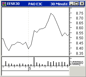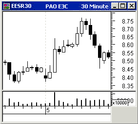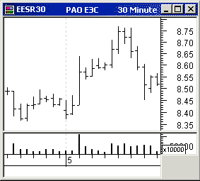 Если нарисовать для каждого периода линию от минимального значения цены вверх до максимального, а затем поставить две короткие черты: от линии влево на уровне цены открытия, от линии вправо на уровне цены закрытия, получим представление графика в виде "баров" ("bars"). Пожалуй это наиболее употребительное представление. Иногда значение для открытия не ставят, ограничиваясь только ценой закрытия.