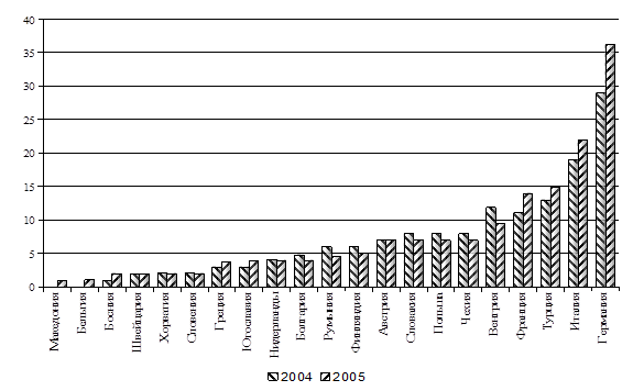 Рис. 3. Экспорт газа в страны Европы в 2004–2005 гг. (разработан