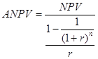Также можно рассчитать эквивалентный годовой аннуитет, или NPV в годовом исчислении (annualized net present value, ANPV) по формуле: