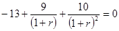 Пусть (1 + r)2 = x. Тогда –13x2 + 9x + 10 = 0. Так как ряд (–13; 9; 10) поменял знак один раз, то IRR – единственная.