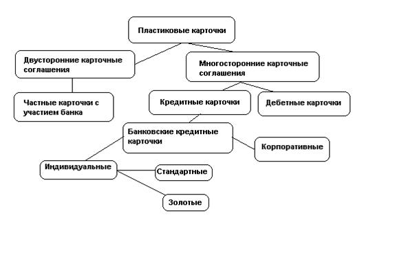 Различаются индивидуальные и корпоративные карточки. Индивидуальные выдаются отдельным клиентам банка и могут быть “стандартными” или “золотыми”. Последние предназначаются для лиц с высокой кредитоспособностью предусматривают множество льгот для пользователей. Корпоративная карточка выдается организации (фирме), которая на основе этой карточки может выдать индивидуальные карточки избранным лицам (руководителям или просто ценным сотрудникам). Им открываются персональные счета, “привязанные” к корпоративному карточному счету. Ответственность перед банком по корпоративному счету несет организация, а не индивидуальные владельцы карточек.