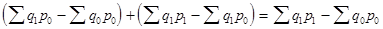 Разность числителя и знаменателя каждого индекса-сомножителя выражает размер изменения общей абсолютной величины под влиянием изменения одного фактора. Алгебраическая сумма этих разностей равна разности числителя и знаменателя индекса стоимости продукции: