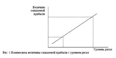 Формирование рыночной инфраструктуры, развитие предпринимательства и кон-куренции требуют изучения теории рисков, методов их оценки и регулирования на всех уровнях хозяйствования. Проблема риска и дохода является одной из ключевых концепций в финансовой и производственной деятельности предприятий. Финансовая деятельность всегда ставит получение доходов в зависимость от риска. Потому что ме-жду величиной дохода и уровнем риска существует прямо пропорциональная зависи-мость, следовательно, чем больше ожидаемый доход, тем больше уровень риска (рис.1). Вероятности получения дохода противостоит возможность убытков.