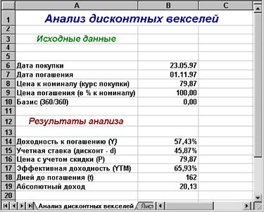 Таким образом, для оценки операций с подобными векселями могут быть использованы ранее разработанные таблицы-шаблоны для анализа краткосрочных ценных бумаг, выпущенных с дисконтом, либо с выплатой процентного дохода в момент погашения (т.е. шаблоны SH_BOND2.XLT, SH_BONDP.XLT и SH_CERT.XLT).