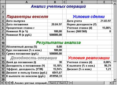 Более подробную информацию о вексельном обращении можно найти в [2, 5, 10, 11]. В настоящем параграфе будут рассмотрены методы анализа типовых операций с векселями и технология автоматизации соответствующих расчетов в среде ППП EXCEL.