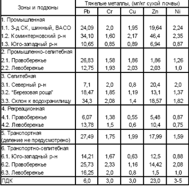 Как видно из таблицы 2, во всех подзонах не наблюдается превышения ПДК по Cr, Сu, Ni, хотя его содержание варьирует в разных местах в 1,5-2 раза. Лишь по Zn наблюдается аномальное превышение в Коминтерновском районе (в 2 раза выше ПДК).