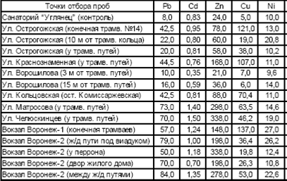Образцы для анализа отбирались в пределах районов действия отдельных поликлиник, разбитых на квадраты 500х500 м независимо от дорог и других аномальных участков. Тяжелые металлы извлекались из почвы ацетатно-аммонийным буфером с рН=4,8 и определялись на атомно-адсорбционном спектрофотометре. ПДК взяты в агрохимслужбе “Воронежская”, они же приводятся в соответствующих справочниках [3].