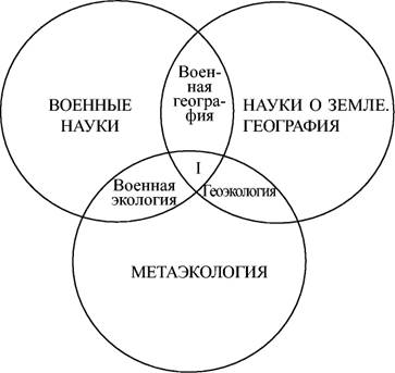 Как указывал Н.Ф. Реймерс, появление в метаэкологии, как междисциплинарном направлении научного знания, все новых ветвей явление вполне закономерное, отвечающее ускоренному общественному развитию и осознанию роли техногенного фактора в процессе становления ноосферы. Военная сфера в ее пространственных параметрах - предельный объект исследования военной географии, военной экологии. В сопрягающейся области их взаимодействия формируется направление, названное нами военной геоэкологией (рис. 1).
