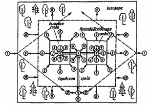 Рис. 1. Негативные факторы воздействия в системе “человек — среда обитания”: 1-естественных стихийных явлений; 2 - производственной среды на работающего; 3 - производственной среды на городскую среду (среду промышленной зоны); 4 - человека (ошибочные действия) на производственную среду; 5 - городской среды на человека, производственную и бытовую среду; 6 - бытовой среды на городскую; 7— бытовой среды на человека; 8 - человека на бытовую среду; 9 - городской среды или промышленной зоны на биосферу; 10 - биосферы на городскую, бытовую и производственную среду; 11 - человека на городскую среду; 12-человека на биосферу; 13 - биосферы на человека.
