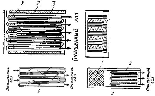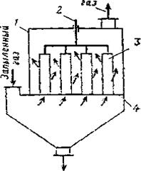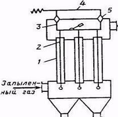 Схема трубчатого электрофильтра представлена на рис. 5. Запыленный газ движется по вертикальным трубам диаметром 200—250 мм. Пыль оседает на внутренней поверхности труб. При помощи встряхивающего устройства ее удаляют в бункер.