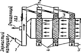 Рисунок 4 - Фильтр с движущимися слоями зернистого материала: 1 - короб для подачи свежего зернистого материала: 2 - питатели; 3 -фильтрующие слои; 4 - затворы; 5 - короб для вывода зернистого материала.