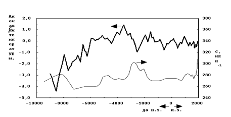 На рис. 3-1 приведено изменение среднегодовой температуры Северного полушария за последние 11000 лет. Значения температуры представлены как отклонения от климатической нормы 1951-80 гг. Нетрудно увидеть, что температура испытывала значительные колебания еще задолго до того, как человек мог оказать, сколько ни будь заметное влияние на глобальные процессы циркуляции атмосферы, ее газовый состав.