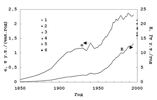 установление факта стабилизации душевого потребления энергии для развитых индустриальных стран, ответственных примерно за 50% мирового потребления топлива. Уровень, на котором происходит стабилизация душевого потребления энергии, определяется исключительно климато-географическими факторами: среднегодовой температурой страны, рельефом и размером ее территории. Этот факт позволяет оценить оптимальное значение е* душевого энергопотребления для каждой страны;