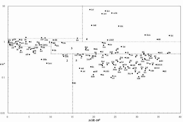 На рис. 3-3 представлена энергодемографическая диаграмма состояния мира в коор-динатах е/е* - душевое потребление энергии в год по отношению к оптимальному для данной страны значению и AGR (Annual Growth Rate) - годовая разность между рождаемостью и смертностью по отношению к общей численности населения.