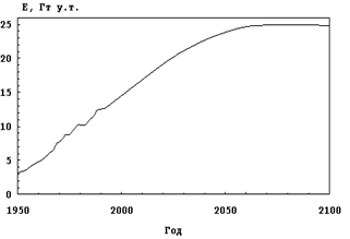 Ожидается, что стабилизация наступит при значениях 24-25 Гт.у.т., отличающихся от нынешнего менее чем в 2 раза. Что же касается душевого потребления энергии, то, пройдя через максимум приблизительно в 2030 г., его значение снизится к концу века до нынешнего уровня (примерно 2,3 т.у.т./(чел. год)). Использование представленных результатов в расчетах концентрации CO2 в атмосфере на основе модели углеродного цикла позволило предсказать изменение этой величины в следующем столетии (рис. 3-6).
