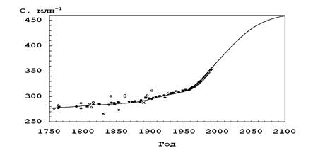 Как видно на рисунке, достигнутая в настоящее время скорость роста концентрации CO2, по-видимому, сохранится в ближайшие 40-50 лет. После этого скорость начнет снижаться, и к концу XXI века будет достигнуто значение около 460 млн-1 , что всего на 65% выше уровня1800 г. Такой результат вселяет определенный оптимизм, так как, по общему мнению экспертов, критическим, после которого можно ожидать необратимых изменений в экосистемах, признается значение концентрации CO2, вдвое превышающее значение для доиндустриальной эры ("280 млн-1).