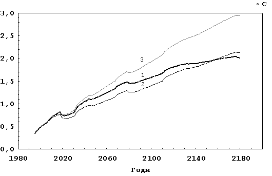 1 – без ограничений эмиссии СО2; 2 – с постоянной эмиссией СО2 на уровне 1990 г.; 3 – с постоянной эмиссией СО2 на душу населения на уровне 1971—1995 гг. Рис. 3-8. Прогноз изменения среднеглобальной температуры в XXI веке.