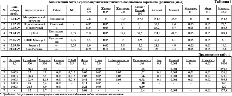 На плиоценовых глинах залегает средневерхнечетвертичный водоносный горизонт, не имеющий хозяйственного значения. Он представлен в виде родникового стока правобережья и используется населением города локально из каптированных родников. Некоторые из них пользуются большой популярностью, хотя родниковая вода отличается несоответствием качества согласно ГОСТу 2874-82 "Вода питьевая" по ряду нормируемых компонентов (табл.1), в силу неглубокого залегания и отсутствия экранирующих слабопроницаемых отложений.