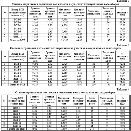 Все предприятия города находятся во втором поясе зоны санитарной охраны действующих коммунальных водозаборов. Наибольшая опасность загрязнения подземных вод, в силу их незащищенности, представляется для левого берега. В настоящее время на участках коммунальных водозаборов отмечаются повышенные содержания железа, марганца, наметилась тенденция увеличения жесткости. Геохимическая природа этих компонентов рассмотрена в работах [1,2]. Насколько же серьезна ситуация в пределах каждого водозабора отражено в табл. 2-4.