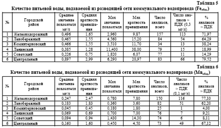 Показатели качества питьевой воды в 1999 году (табл. 5,6) по районам города говорят о том, что качество питьевой воды в разводящей сети не отвечает требованиям ГОСТа 2874-82 "Вода питьевая" по содержанию железа (1-6 ПДК в Советском районе, 1,2-12 ПДК в Коминтерновском, 1,7-10 ПДК в Железнодорожном, 1,6-15 ПДК в Левобережном, 1,3-38 ПДК в Ленинском и 3-21 ПДК в Центральном районе). Повышенные содержания марганца варьируют в пределах 1-14 ПДК в целом по районам города.