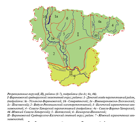 Рекреационное районирование и туристические зоны Воронежской области. Специфика природы Воронежской области такова, что долины рек являются практически единственными местами отдыха. Особенно перспективны в рекреационном отношении долины Дона, Воронежа, Хопра, Вороны, Битюга, Савалы.