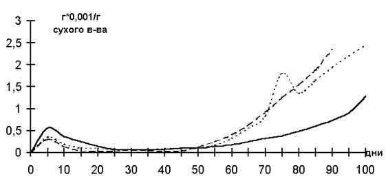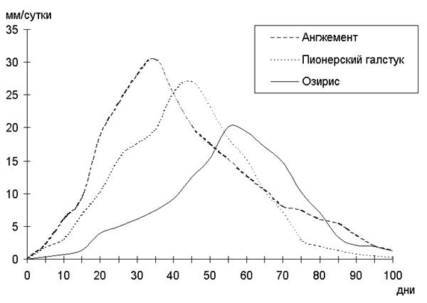 Поскольку задачей настоящего исследования было сопоставление онтогенетической динамики изучаемых процессов, мы полагаем корректным представление данных в виде среднесуточных изменений анализируемых параметров. Характер изменений изученных процессов в онтогенезе оказался одинаковым у всех сортов. Однако скорость этих изменений у разных сортов заметно варьировала в зависимости от скороцветности. Ниже приведены данные по трем сортам, различающимся сроками зацветания: ранний сорт Ангажемент, среднеранний - Пионерский галстук и средний - Озирис.