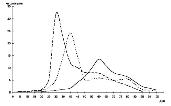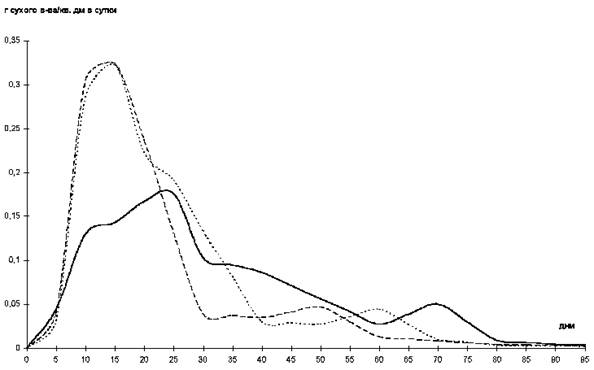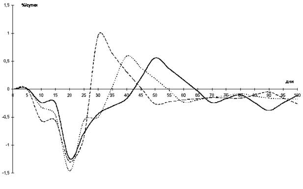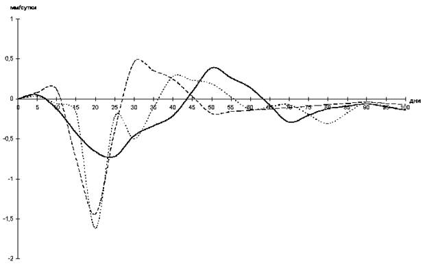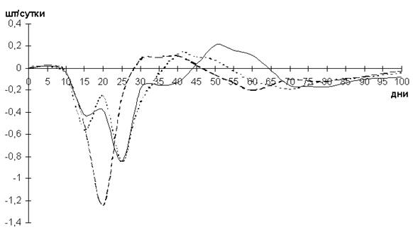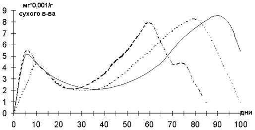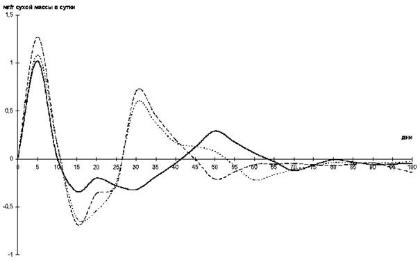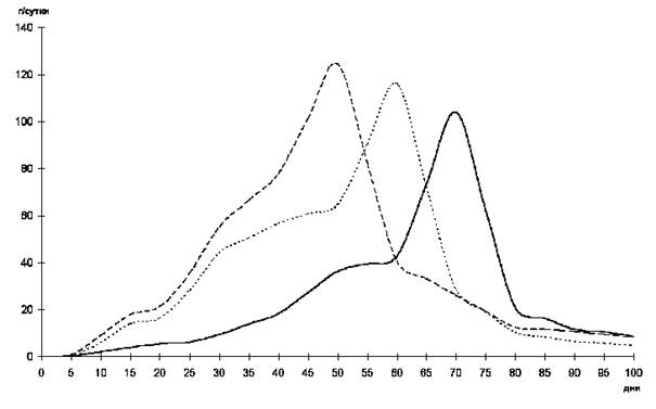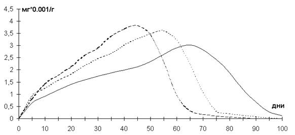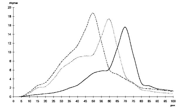 Существенными показателями являются также увеличение массы растения и площади листьев. На графиках рис. 2 и 3 отражен среднесуточный прирост сырой и сухой массы георгины. Как следует из графиков, изменение темпов увеличения массы также описывается одновершинной кривой. Вместе с тем, максимум среднесуточного прироста сырой и сухой массы приходится на конец фазы бутонизации и отстоит от максимального темпа роста растений в высоту на 15-20 дней.