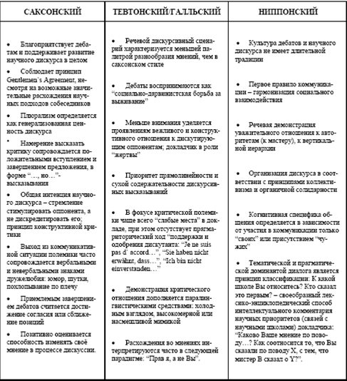 Представленные в таблице основные аспекты, характеризующие особенности научных дискурсов в разных культурах, позволяют сделать вывод о саксонском и ниппонском стилях как о более толерантных и демократичных по сравнению с двумя другими. Справедливости ради следует отметить, что в рамках саксонского интеллектуального стиля Гальтунг выделяет разницу между коммуникативными нормами американской и британской культур. Американский стиль коммуникации обозначается им как в большей степени демократичный и великодушный, чем английский.