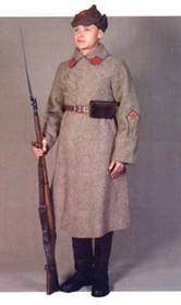 И вот разноцветье формы 18-19-х веков, когда каждый полк одевался по-своему, было нарушено на первый взгляд однообразно зелёной советской формой. Вскоре приказом РВСР № 628 от 8 апреля 1919 года были утверждены первые образцы обмундирования: головной убор в виде шлема, пехотная и кавалерийская шинели с тремя нашивками-хлястиками на груди ("разговоры") из цветного сукна по роду войск, летняя рубаха с тремя полосками сукна на груди цветом по роду войск и кожаные лапти.
