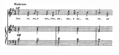 У романсі «Земле моя, всеплодющая мати» (сл. І. Франка) оспівано радість праці. Музика його світла, мажорна. Проста мелодія упевнено розгортається по звуках мажорного тонічного акорду (Додаток 10). Звернення до землі як до джерела щастя і радості характерне і для народних пісень, і для творчості українських митців. Лаконізмом позначена й фортепіанна партія; вузькооб'ємні акорди створюють гармонічну основу для вільного розвитку мелодії. Мажорного тонусу надають романсові септакорди (наприклад, І, VIта ін. ступенів), маршовий ритм мелодії.
