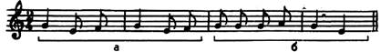 Мотивы отличаются один от другого и по ритму и по звуковысотности. Схема их распределения: а + б.