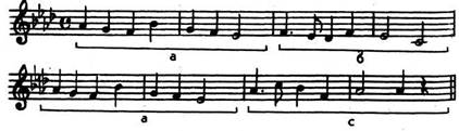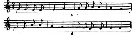 Здесь явно повторяются два одинаковых мотива. Ритмический рисунок мелодии состоит только из восьмых. Поэтому при анализе этих мотивов можно учитывать лишь звуковысотность. Схема распределения мотивов мелодии: а+а.При заучивании всей мелодии достаточно запомнить один мотив и его повторить при воспроизведении его данной схеме, то естьдва раза.