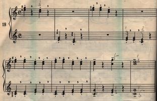 Иногда хочется использовать так называемую предварительную педаль. Это когда нога раньше ложится на педаль, чем пальцы на клавиши, и как бы весь воздух заранее наполнен предвкушением начального созвучия, например : О.Строк «О, эти чёрные глаза» (см. приложение стр. 10).