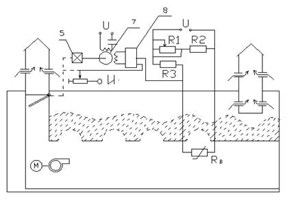 Управляющее воздействие на (ОУ) является степень смешивания холодного и рециркуляционного воздуха. Основное возмущающее воздействие - изменение температуры наружного воздуха . Датчиком (Д) является термометр сопротивления . Входной сигнал для него температура в картофелехранилище, выходной сигнал - величина сопротивления Задатчиком является переменное сопротивление