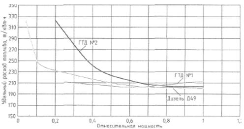Характеристики удельного расхода топлива дизелем Д49 (1-9ДГ) мощностью 2206 кВт, замеренные на тепловозе, а также ориентировочные (расчетные) газотурбинными двигателями №1 и №2 мощностью соответственно 4 и 6 тыс. кВт (рис. 1). В связи с отсутствием опытных образцов таких двигателей расход топлива на холостом ходу и потребность в маслене определены.