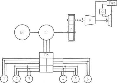 К — компрессор; Per — регенератор; Кс — камера сгорания; Т — турбина; Р - редуктор; СГ — синхронный тяговый генератор; ВГ — вспомогательный генератор; Пр — преобразователь частот; 1 —6 —асинхронные тяговые двигатели