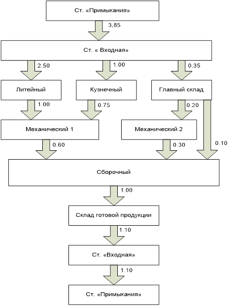 2. Диаграмма грузопотоков вычерчивается на основе заданных цехов и установленных грузопотоков на основании общих положений. Грузопоток изображается полосой в масштабе 1 см-1 млн. т при правостороннем направлении грузопотока.