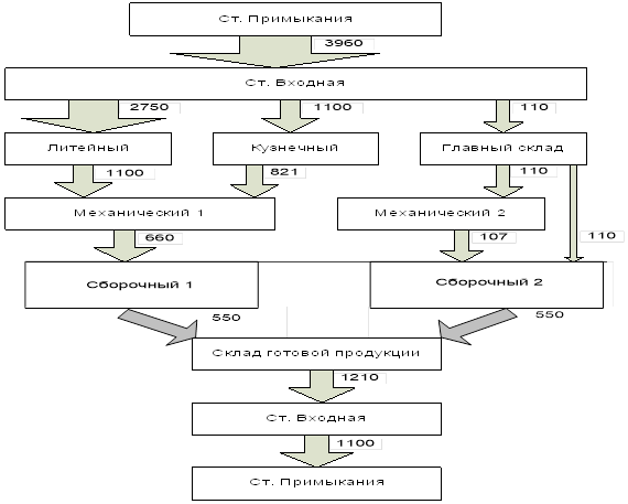 Выпуск готовой продукции по заданию, в соответствии годовой программой завода, составляет Q тыс.т. в год, эта величина является основанием для определения потребностей цехов предприятия в перевозках и рассчитывается на основании расходных коэффициентов (рисунок 2).