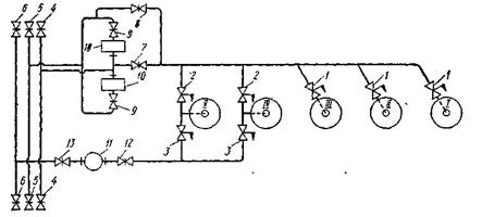 по коротким всасывающим трубам и подают по напорным трубам в раздаточный трубопровод 13,