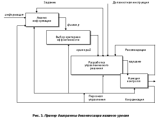Данный процесс моделирования абсолютно совпадает по сущности с реальным процессом регламентации управленческой деятельности, когда идет детализация ее содержания по уровням "функция-работы-операции-комплексы приемов-приемы-…".