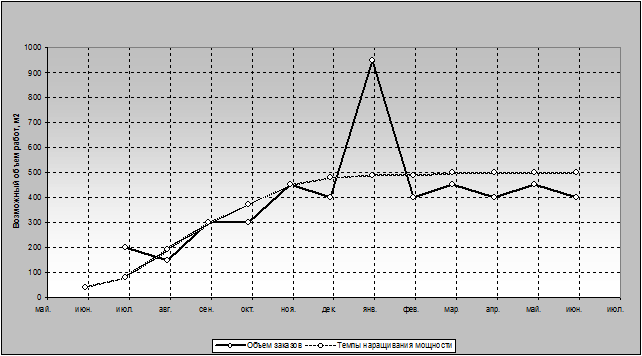 При уменьшении объема заказов в первую очередь определялся его критический уровень – превышение затрат над доходами от реализации. Для ООО «Ваша дача» он составит 83% (таблица 4.1). Это означает, что стратегии, направленные на создание крупного производства менее рискованные, чем ориентированные на небольшие объемы работ.