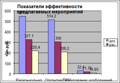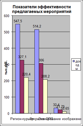 Внедрение услуги по сканированию изображений для записи на дискету с возможностью дальнейшего использования в Интернет принесет дополнительно 10,65 тыс. руб. прибыли. Срок окупаемости планируется 5,2 лет с коэффициентом эффективности 0,19.